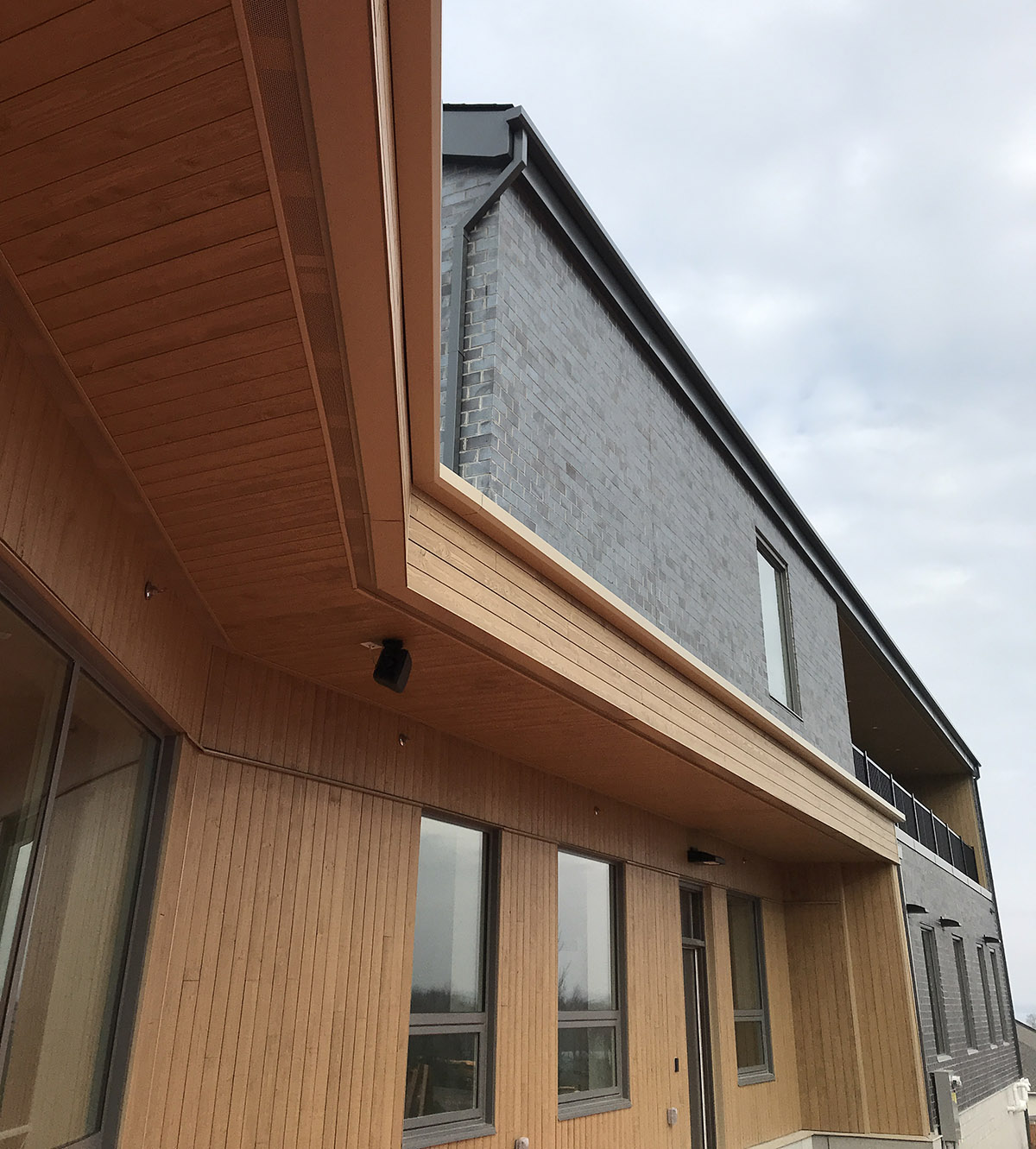 A photo of Green Haven’s entrance canopy, which is clad in wood and brightly lit.